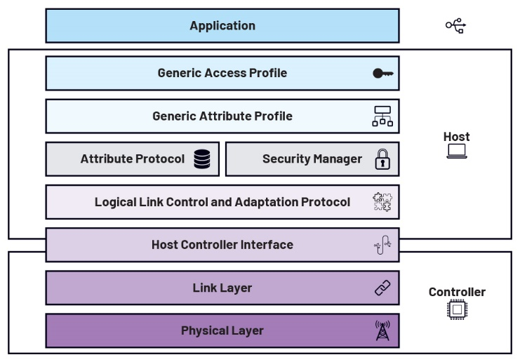 BLE协议栈架构通常分为三个主要层级:应用层、主机层和控制器层。应用层是协议栈的最顶层。BLE设备上运行的应用程序在这一层利用和处理实际数据。主机层位于协议栈中的应用层和控制器层之间,实现了BLE通信所需的所有较高级别协议和配置文件。此外,它还提供高级应用程序编程接口(API),使得应用程序能够与协议栈的较低层交互。控制器层是BLE协议栈的硬件部分,负责蓝牙信号的发送和接收。控制器层处理信号的跳频、调制和解调等任务。上述层级协同工作,实现BLE设备之间高效可靠的通信。