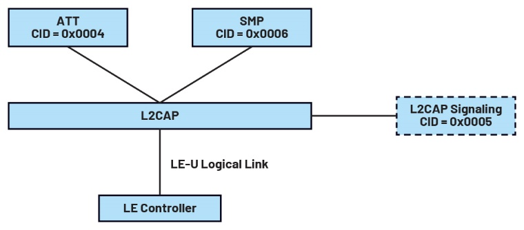 来自ATT层的数据包将经由L2CAP层处理。若有需要,L2CAP执行数据分段和重组。该层为每个L2CAP数据包添加L2CAP标头。