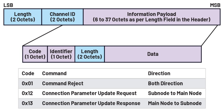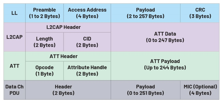 图10总结了BLE协议栈架构中各层的数据包格式,并概要显示了数据的结构。