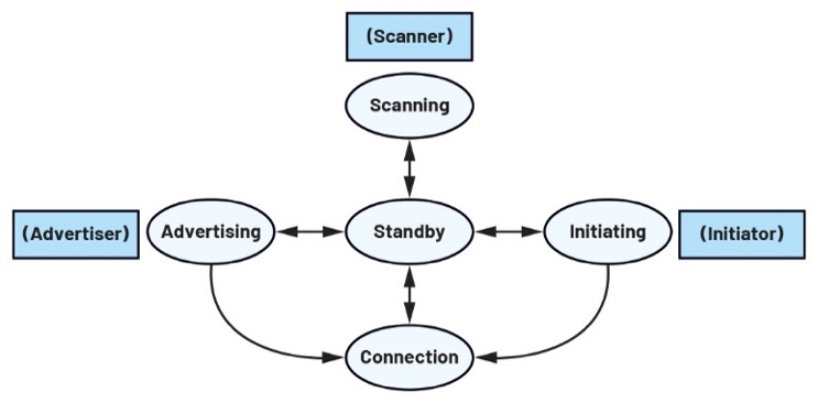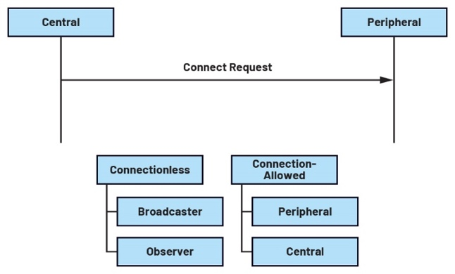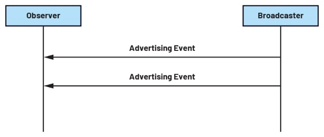 GAP根据BLE设备的活动状态为其提供不同的角色。当不需要连接时,BLE设备可以充当广播者或观察者。广播者是一种在邻近范围内宣告自身存在的设备。它主要利用链路层的广播者角色发送广播。观察者与广播者相反,它利用链路层的扫描者角色扫描相关区域,以接收来自附近设备的广播。在现实生活中,广播者的例子有BLE信标,而观察者的例子有收集数据的BLE集线 广播者向观察者发送广播数据包