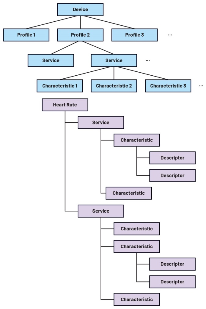 一个BLE设备中可能存在多个GATT配置文件(图11)。蓝牙规范中定义了标准配置文件,以确保不同制造商生产的BLE设备能够互操作。但是,基于特定应用要求,也可以实现自定义配置文件。因此,了解GATT配置文件的结构至关重要。