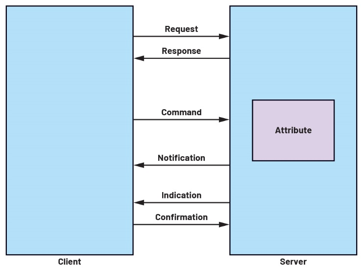 ATT定义了六种协议数据单元(PDU)类型:请求、响应、命令、确认、通知和指示(图8)。请求PDU由客户端发送给服务器,请求回复。响应PDU是请求回复时服务器对客户端的回复。命令PDU由客户端发送给服务器,无需回复。指示PDU由服务器发送给客户端,需要回复。确认PDU由客户端发送给服务器,作为对指示的回复。通知PDU由服务器发送给客户端,无需回复。通过这些PDU类型,客户端和服务器可以在BLE协议栈的ATT层交换信息和进行控制。