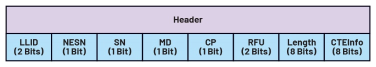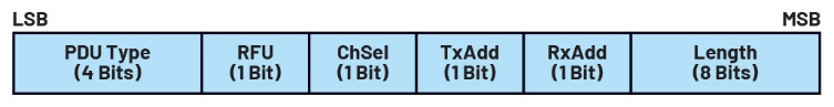 标头包含以下字段:PDU类型、RFU(保留以备将来使用)位、ChSel、TxAdd、RxAdd和长度。ChSel、TxAdd和RxAdd位的值取决于PDU类型,而长度字段用于描述有效载荷的长度(以字节为单位)。